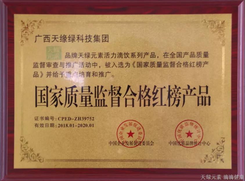 2018年1月15日天綠元素榮獲國(guó)家質(zhì)量監(jiān)督合格紅榜產(chǎn)品