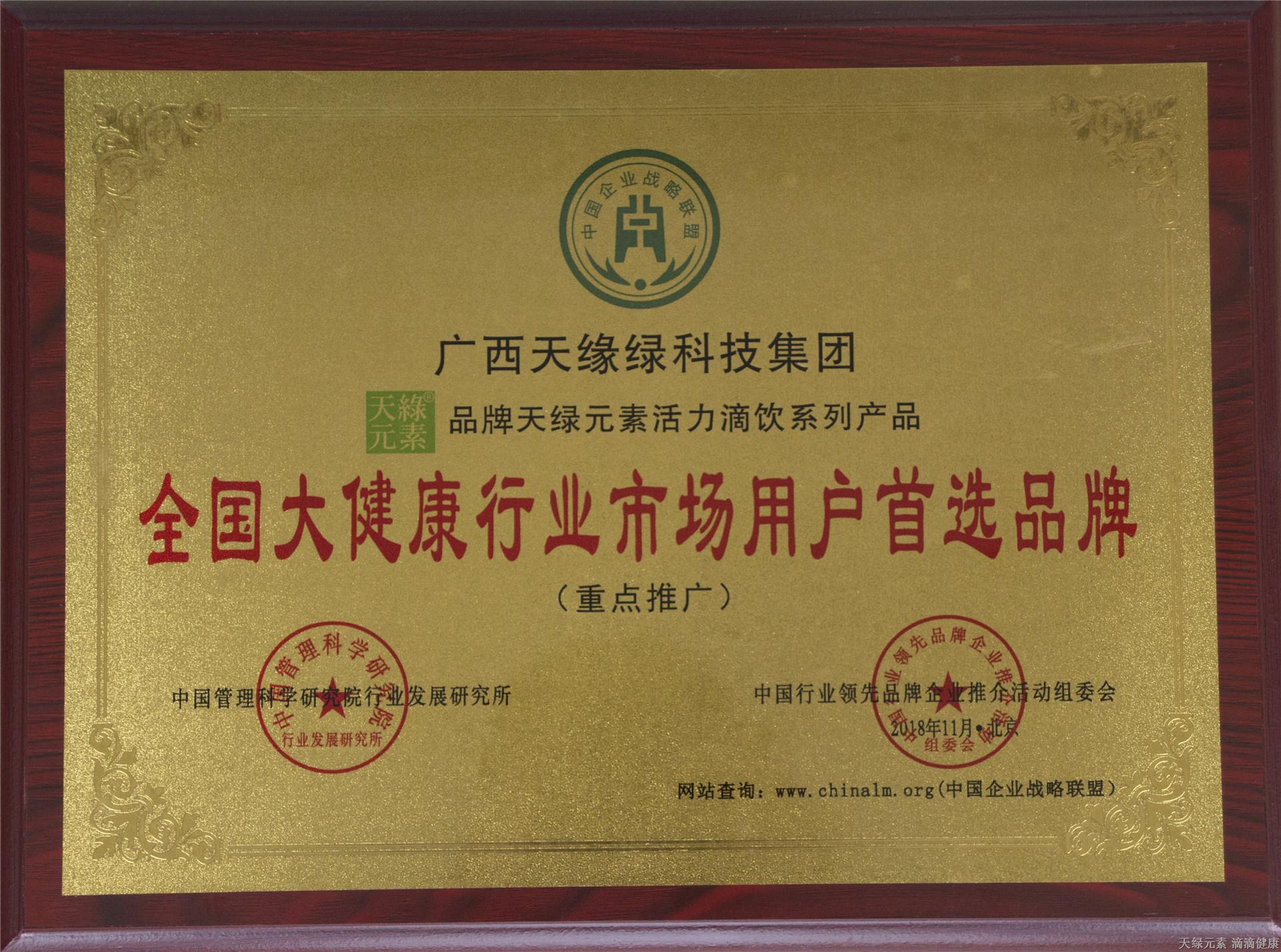 2018年11月, 天緣綠集團(tuán)獲全國(guó)大健康行業(yè)市場(chǎng)用戶首選品牌稱號(hào)